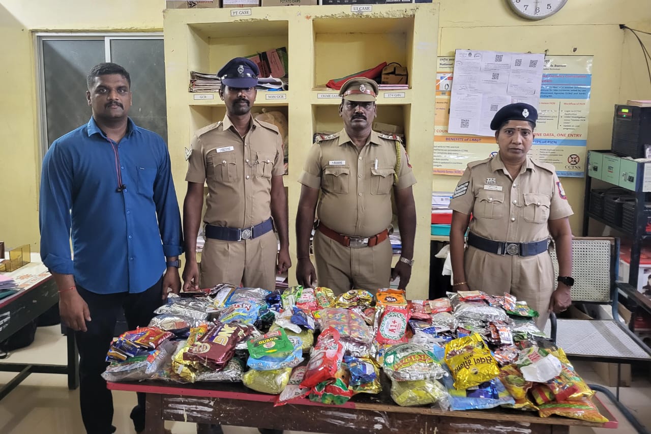 சிதம்பரம் இருப்புப்பாதை காவல் ஆய்வாளர் திரு.கார்த்திகேயன் அவர்கள் உத்தரவின் பேரில் SSI தியாகராஜன், SSI .ரவி, Special Baranch GrI 1336 Tr.கோபாலகிருஷ்ணன், GrI 1380 Tr.தமிழ்ச்செல்வன், PC 815 Tr.ஞானசபை ஆகியோர் சிதம்பரம் ரயில் நிலைய நடைமேடை எண் 3-ல் வந்து நின்ற T. No 16779 திருப்பதி to இராமேஸ்வரம் வரை செல்லும் விரைவு வண்டியில் பின்பக்கம் உள்ள பொது பெட்டியில் சோதனை செய்தபோது வெள்ளை நிற சாக்குப்பையில் கேட்பாரற்று கிடந்த தமிழக அரசால் தடை செய்யப்பட்ட சுமார் 25 கிலோ எடையுள்ள புகையிலை, பான் மசாலா மற்றும் குட்கா போன்ற போதை பொருட்கள் இருந்ததை கைப்பற்றி சிதம்பரம் இருப்புப்பாதை காவல் நிலையம் கொண்டு வந்து விசாரணைக்கு பின் சிதம்பரம் உணவு பொருள் பாதுகாப்பு அலுவலர் அவர்கள் வசம் ஒப்படைக்க தகவல் தெரிவிக்கப்பட்டுள்ளது.